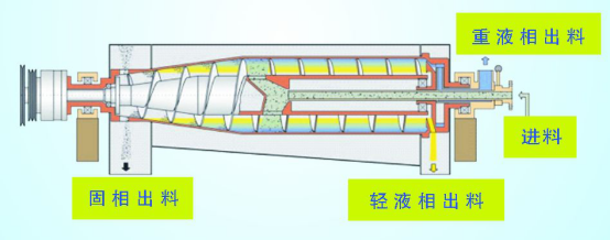 待分離的物料通過(guò)進(jìn)料管,進(jìn)入螺旋推料器的加速腔后進(jìn)入高速旋轉的轉鼓內壁,由于物料中輕液相—重液相—不溶性的固相的比重不同,其三相物料所受到的離心力大小不一樣,不溶性的固相由于比重最大受到的離心機最大而被沉降到內壁(最外面),輕液相由于受到的離心力最小而被沉降到離轉鼓內壁最遠(最外面),重液相在它個(gè)中間,不溶性的固相通過(guò)與轉鼓有相對差速的螺旋推料器而由固相出料口排出,輕、重液相再通過(guò)機器內的不同結構各自分開(kāi),其中重液相通過(guò)向心泵排出,輕液相通過(guò)重力排出,從而過(guò)到物料三相分離的目的。我公司的三相臥螺離心機的輕、重液相分別是通過(guò)重力排出和離心力排出,從而有效的避免了物料的混相而導致物料分離不徹底,普通的三相臥螺離心機在工作時(shí)常常由于輕、重液相的組分不穩定而導致分離不徹底,我們推出的三相臥螺離心機可以根據物料的組分的變化在機器工作時(shí)對其輕重液相的界面進(jìn)行調整,從而使物料的分離達到最佳的效果。